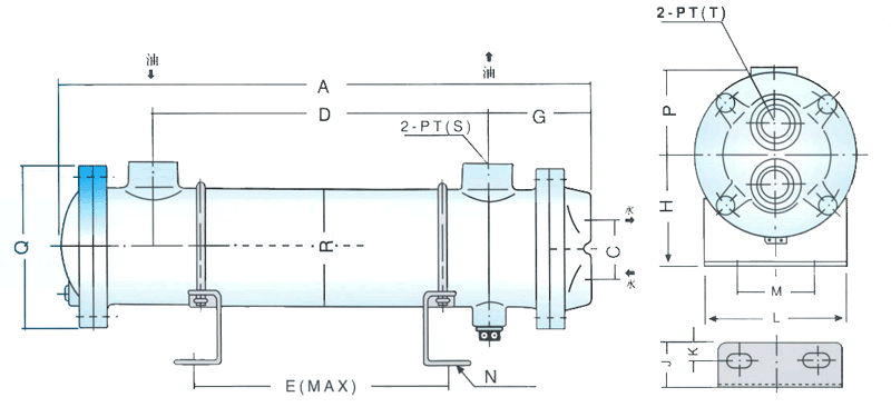 形式編號(hào) | A | C | D | E | G | H | J | K | L | M | N | P | Q | R | S | T | 最大流量L/min | 散熱面積m2 |